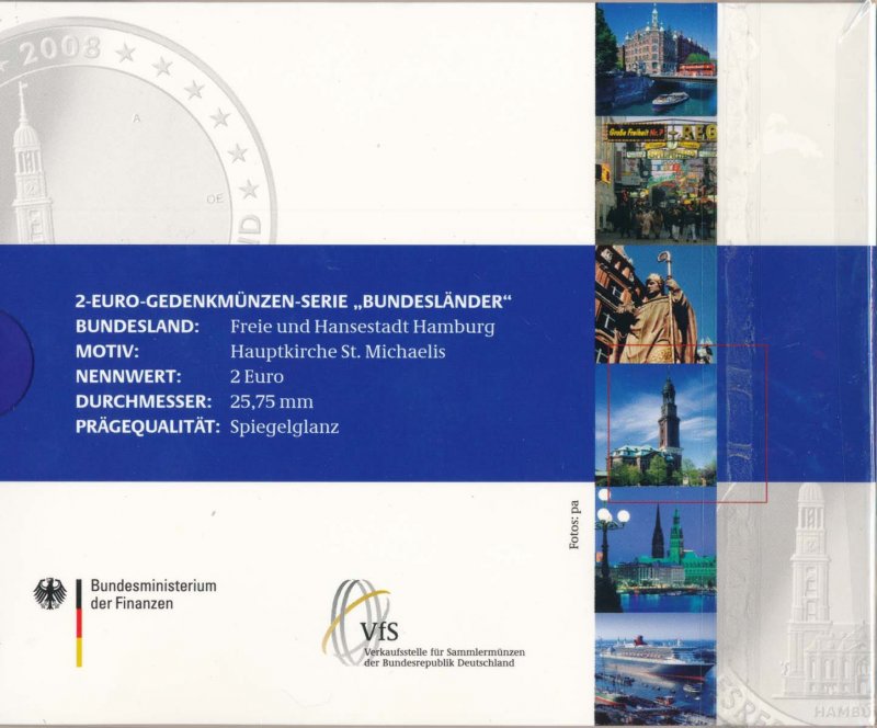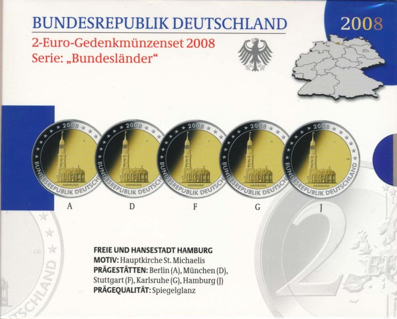 BRD 2 Euro 2008 A-J PP Satz Hauptkirche St. Michaelis im Folder der VfS*