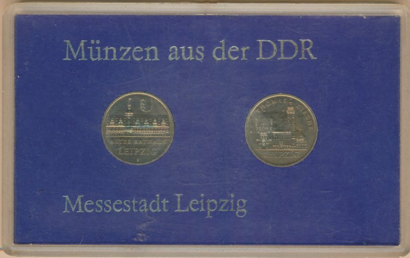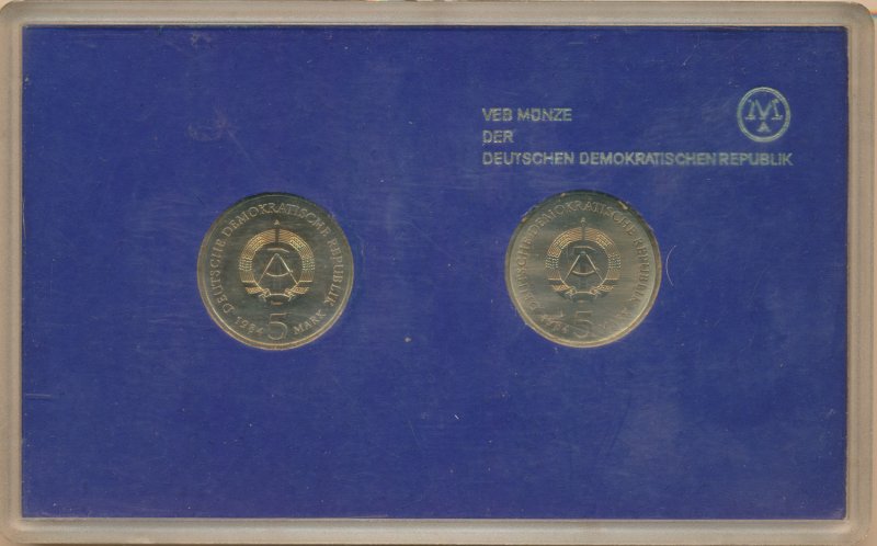 DDR Satz aus 2x 5 Mark 1984 A Messestadt Leipzig verschweisst in Hartplastik*