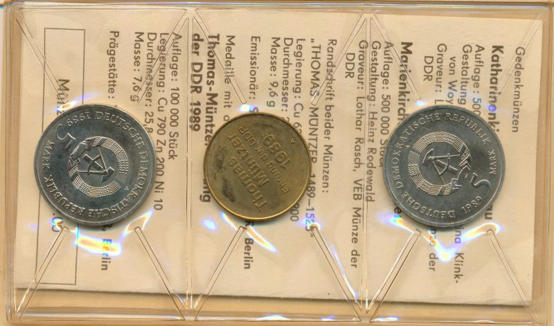 DDR Satz aus 2x 5 Mark 1989 A Thomas MüÂntzer verschweisst im orig. Etui*