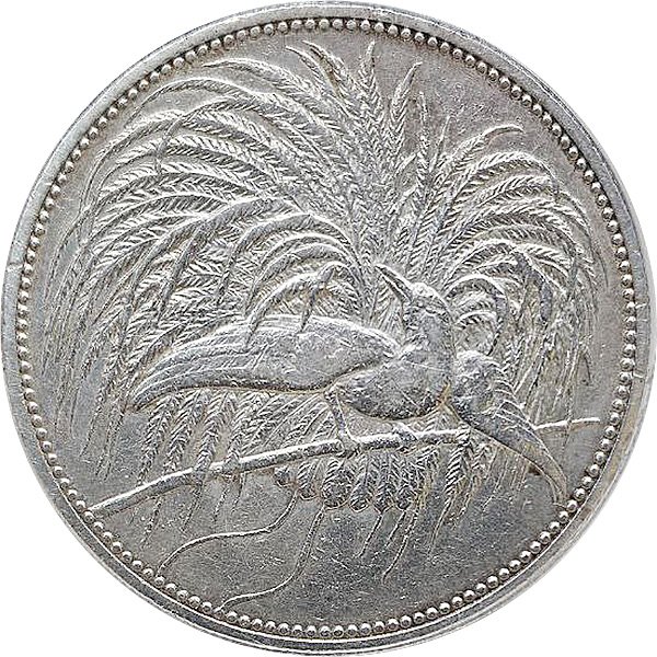 Die 5-Mark-Münze aus Neuguinea, geprägt im Jahr 1894 mit dem Münzzeichen A (Berlin), zählt zu den seltenen Ausgaben der deutschen Kolonialprägungen. Sie entstand im Auftrag der Neu-Guinea Compagnie, einer privaten Handelsgesellschaft mit Verwaltungsrechten über Teile Deutsch-Neuguineas, bevor das Gebiet 1899 in direkte Reichsverwaltung überging.