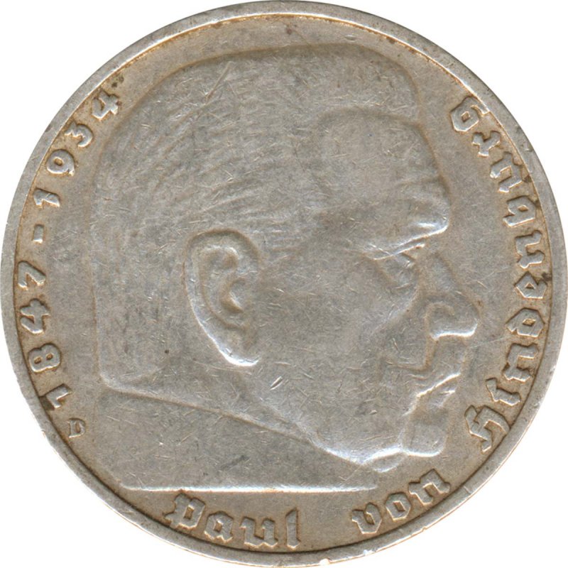 Drittes Reich 5 Mark 1936 D Paul von Hindenburg J. 367 Silber*