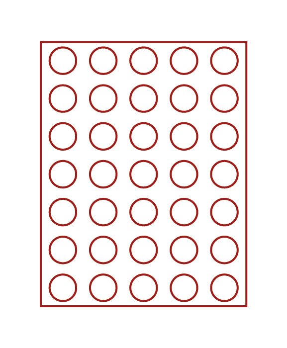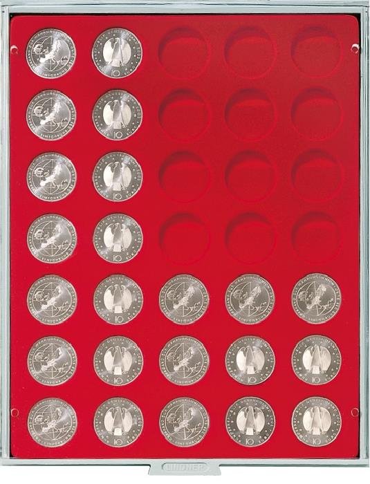 • Dunkelrote Münzeinlage mit 35 runden Vertiefungen.
